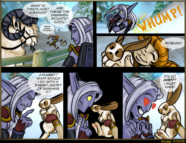 The Quest Continues: Lucky Rabbit by smudge on September 29, 2005 at 1:00 am Chapter: The Adventures of Blanc Blanc. Night Elf. Warrior. Fashion Victim. Impulse Buyer. └ Tags: Blanc, War Bunny Related Comics ¬ Test post Your Move BREAK: Birthday Bunny Form Fashion Boat Ride